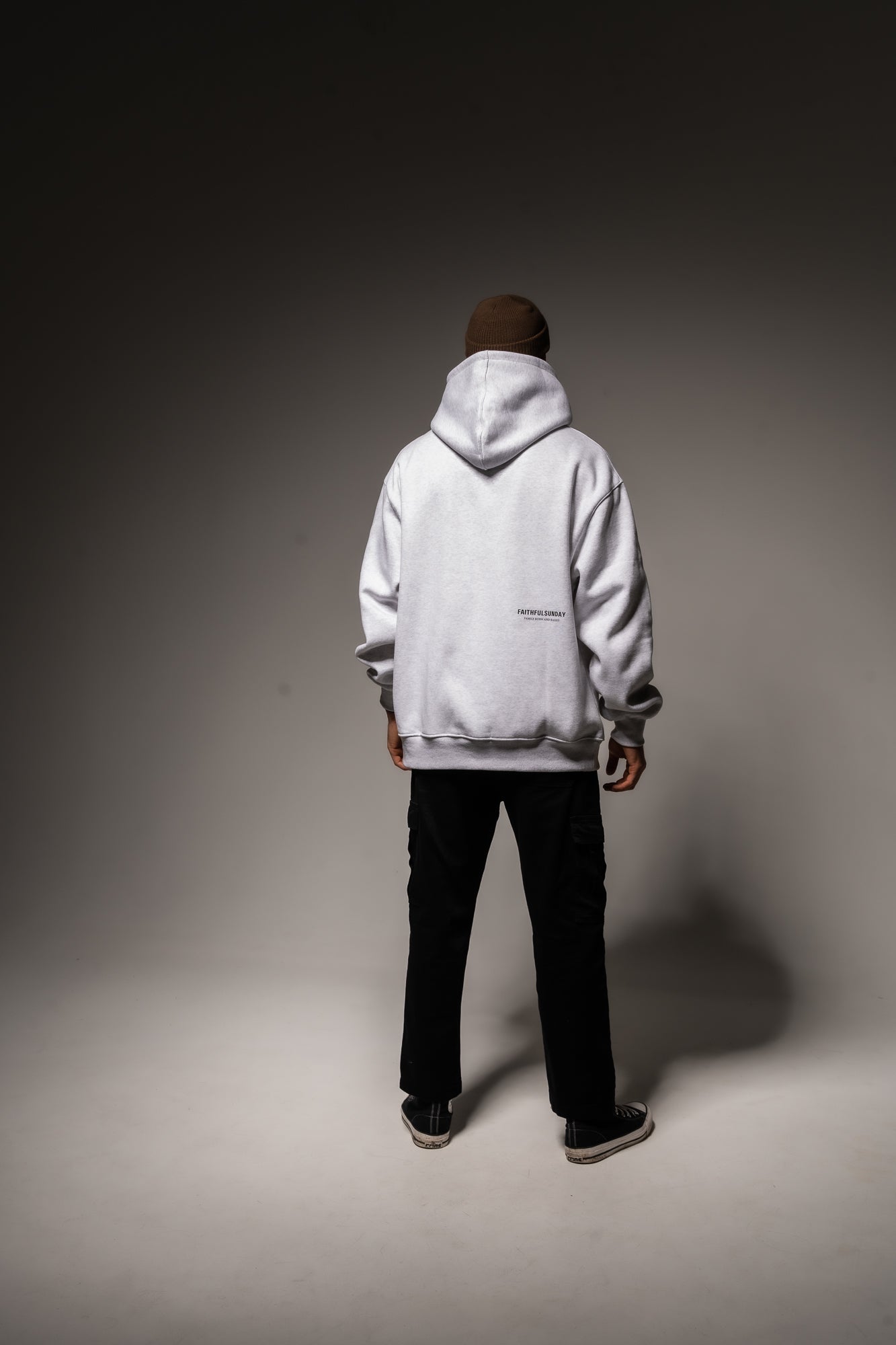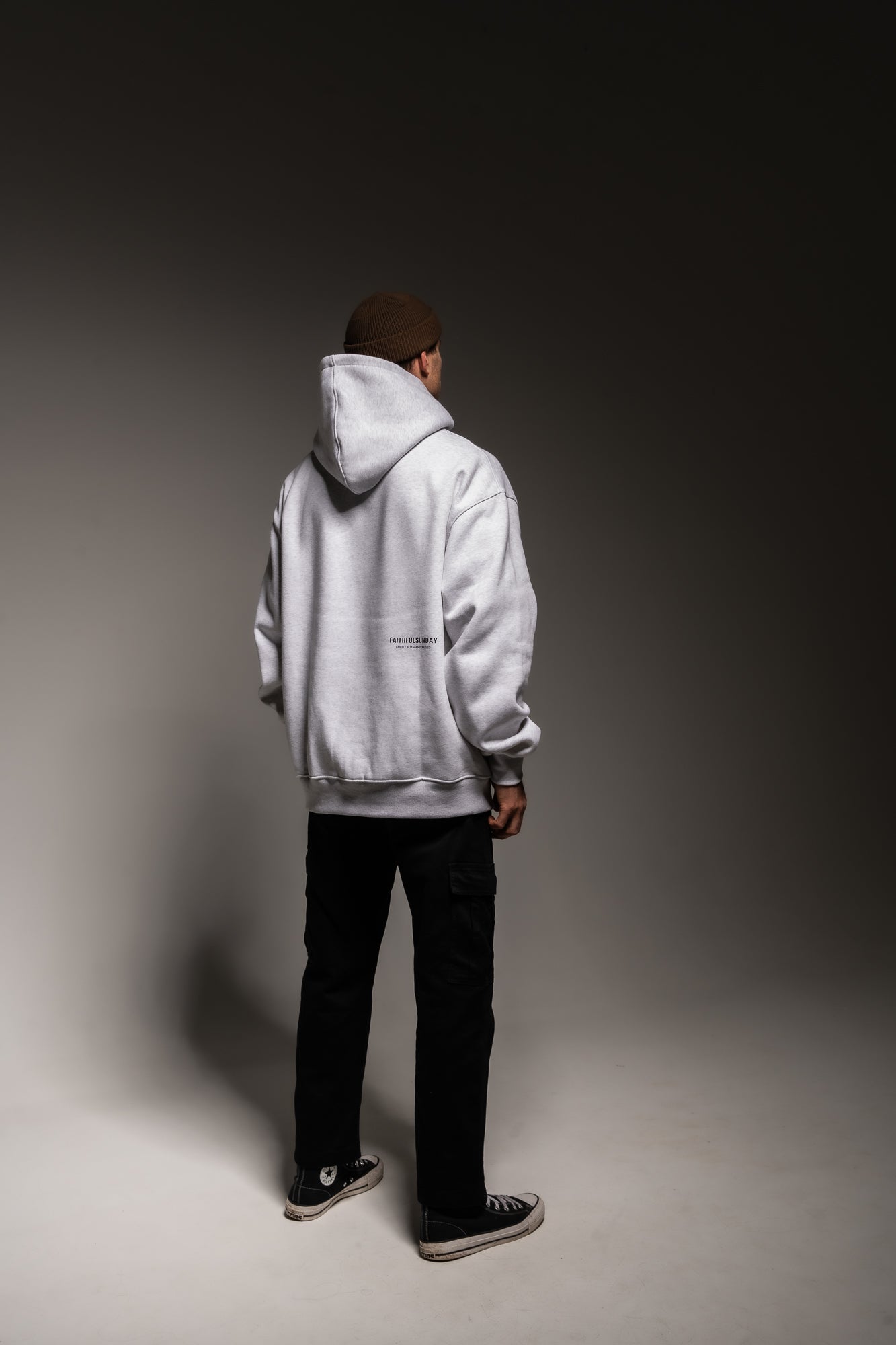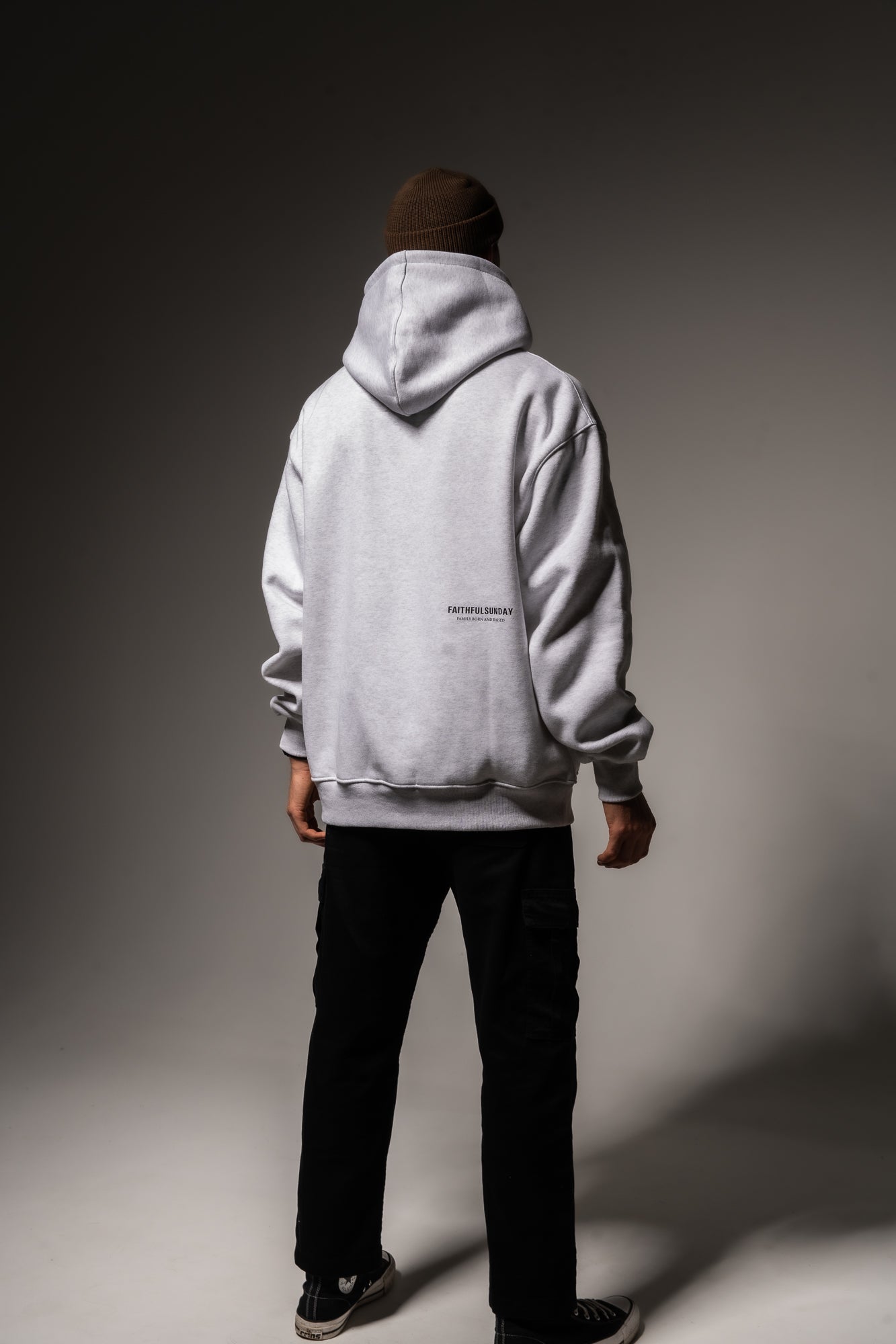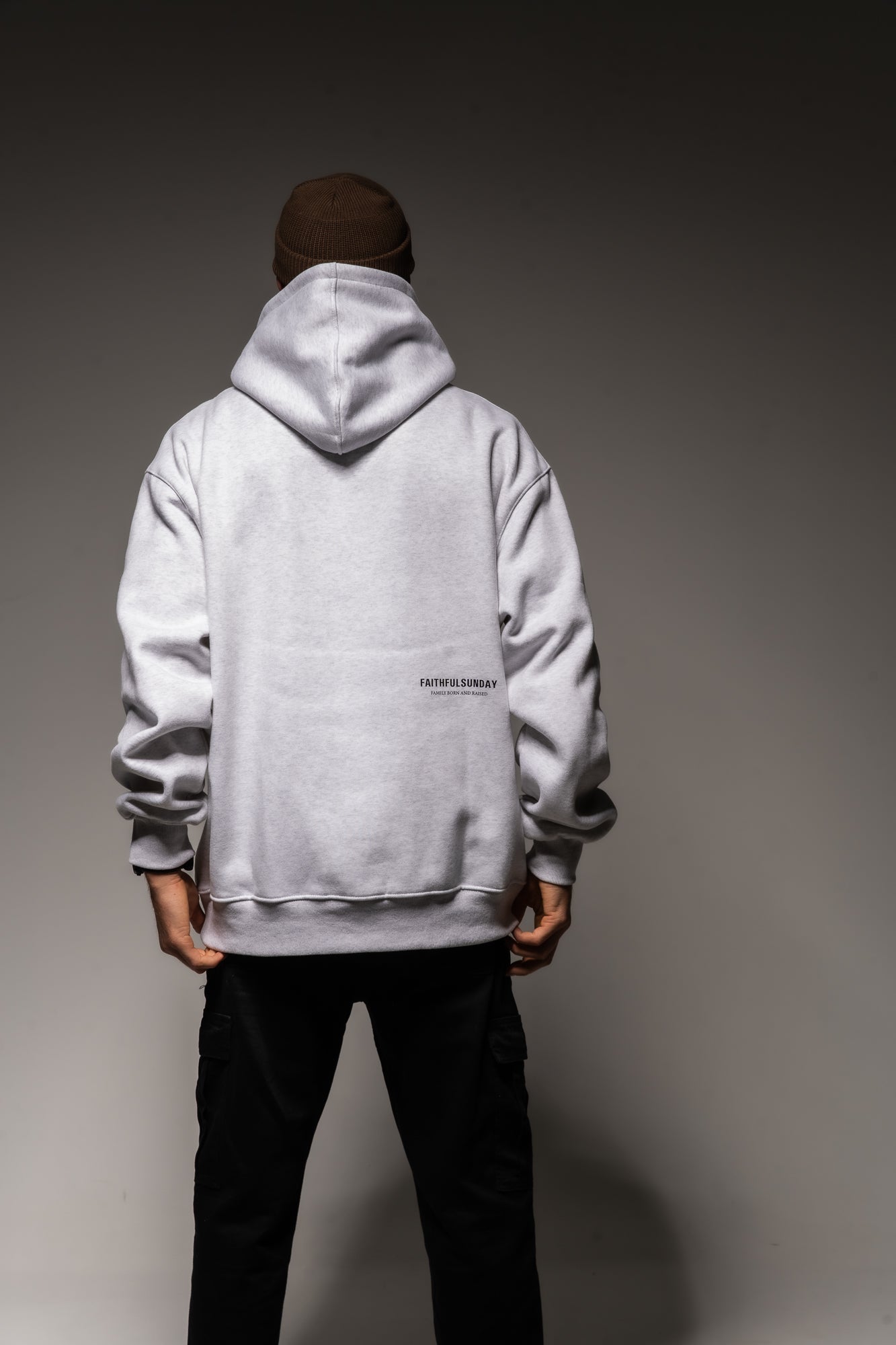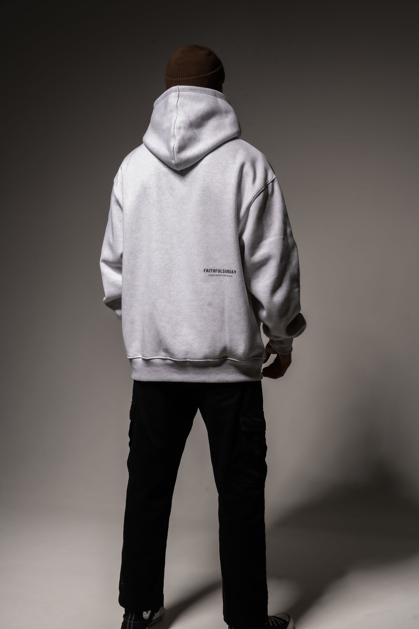 BLACK FAITHFUL SUNDAY PRINT ON FRONT LEFT SIDE ABOVE POCKET AND ON THE BACK RIGHT-HAND SIDE WITH QUOTE “FAMILY BORN AND RAISED”.